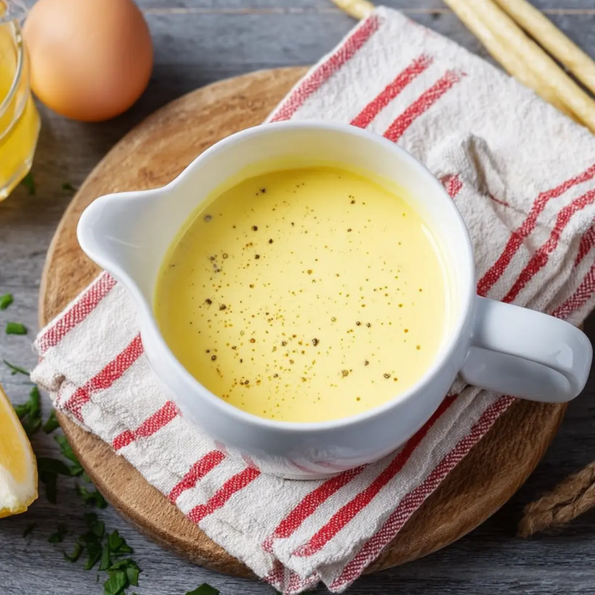 - Wasser oder Spargelsud – Gibt der Hollandaise etwas Leichtigkeit und verbindet die Zutaten optimal. Spargelsud bringt einen zusätzlichen Hauch von Aroma.